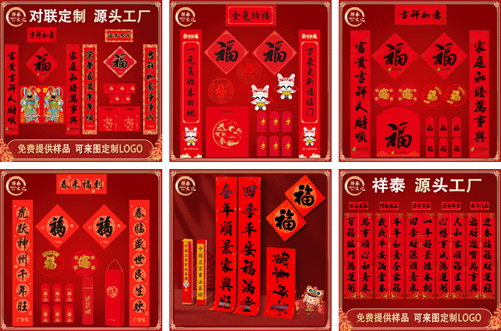 專業定制廣告對聯春聯、福字、窗花、紅包、禮包/禮盒。定制產品:植絨對聯、植絨福字、燙金對聯、彩印對聯、剪紙、利是封、紅包、彩印禮包、無紡布禮袋